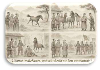 Cette parabole millénaire révèle ainsi une sagesse essentielle : chaque événement contient en germe des possibilités insoupçonnées et notre jugement hâtif sur ce qui nous arrive nous aveugle souvent sur la raison d’être véritable de l’existence et le sens profond celle-ci.